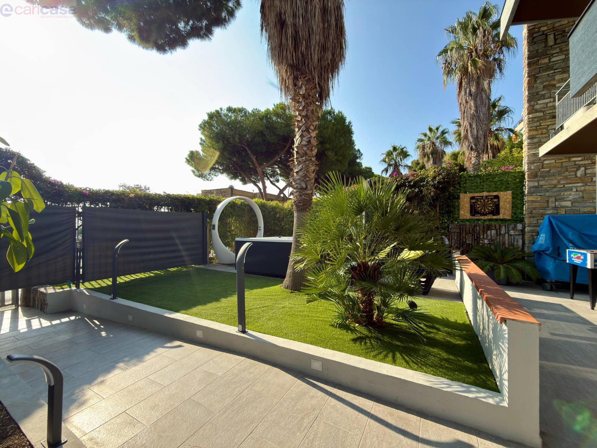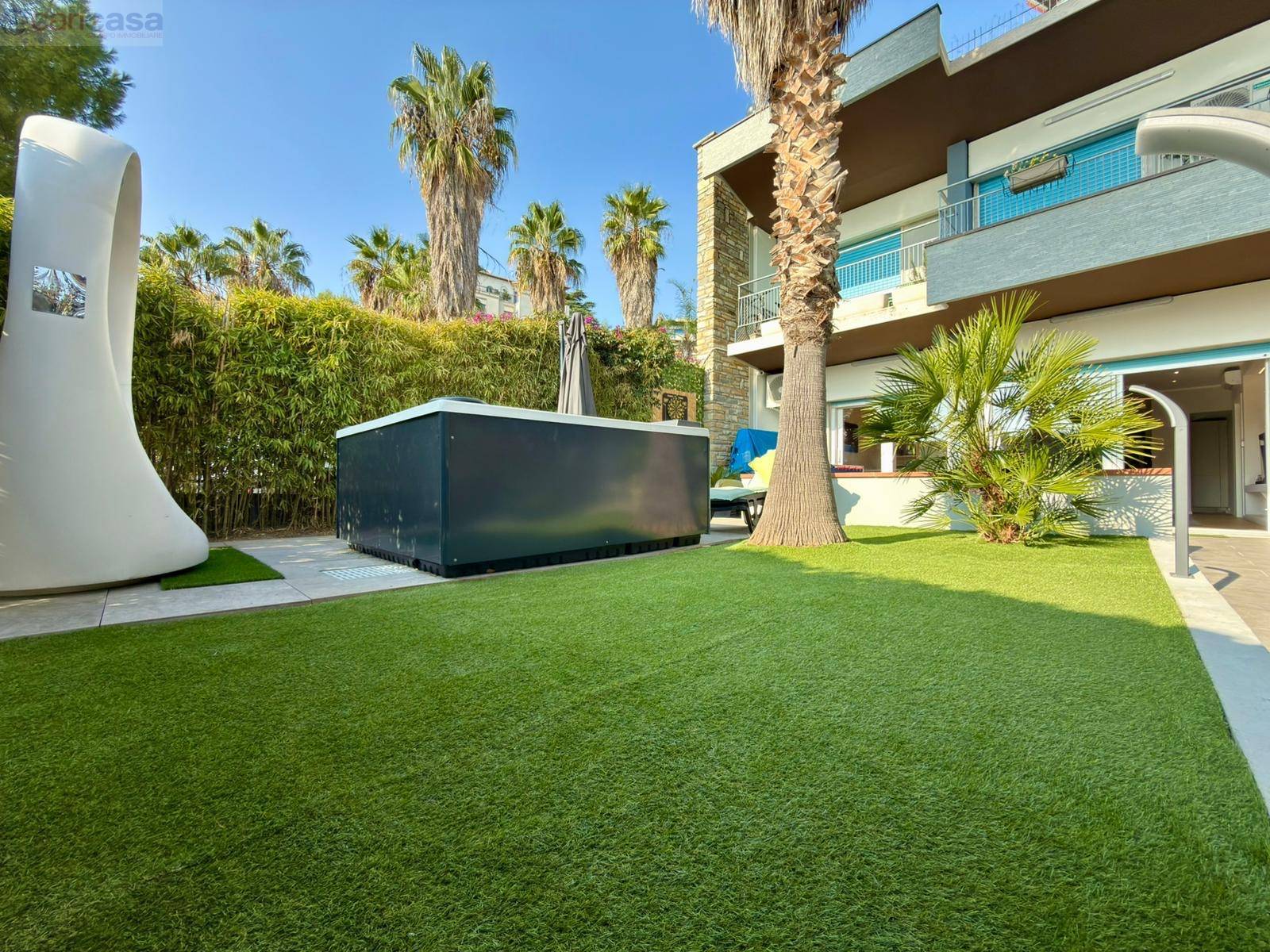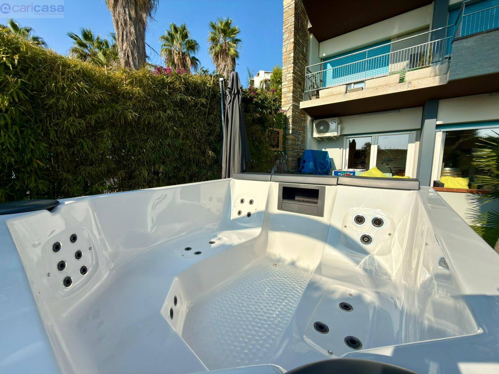 All’esterno, un meraviglioso giardino arredato con piscina jacuzzi offre uno spazio ideale per rilassarsi e godere appieno del clima mite e della vista mare.Dotazioni di alto livello: aria condizionata, tapparelle elettriche, impianto di videosorveglianza e finiture di ultima generazione.