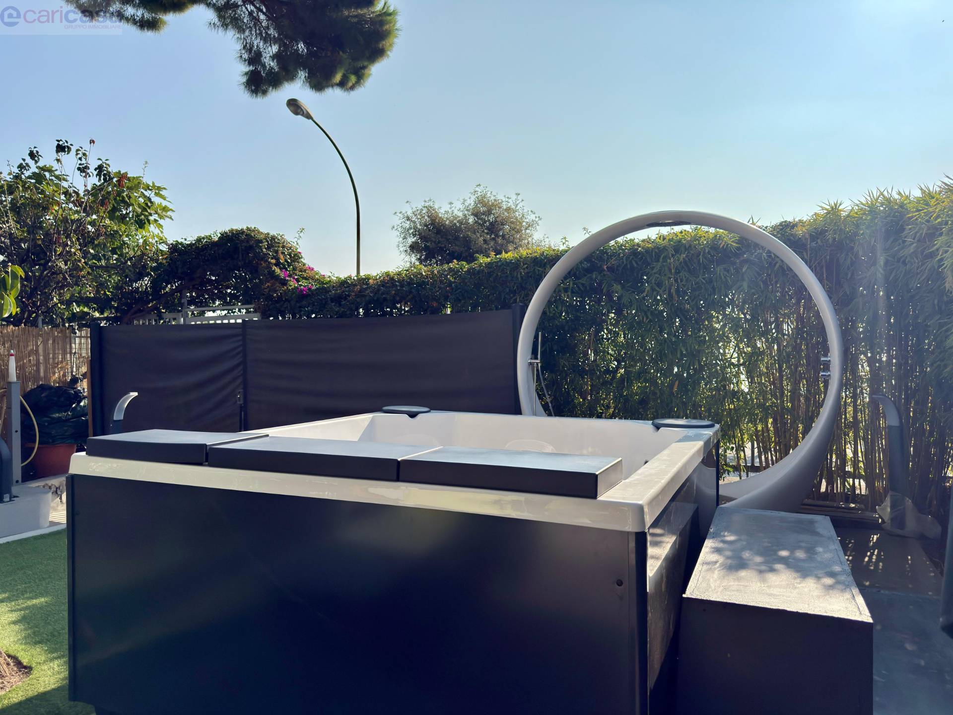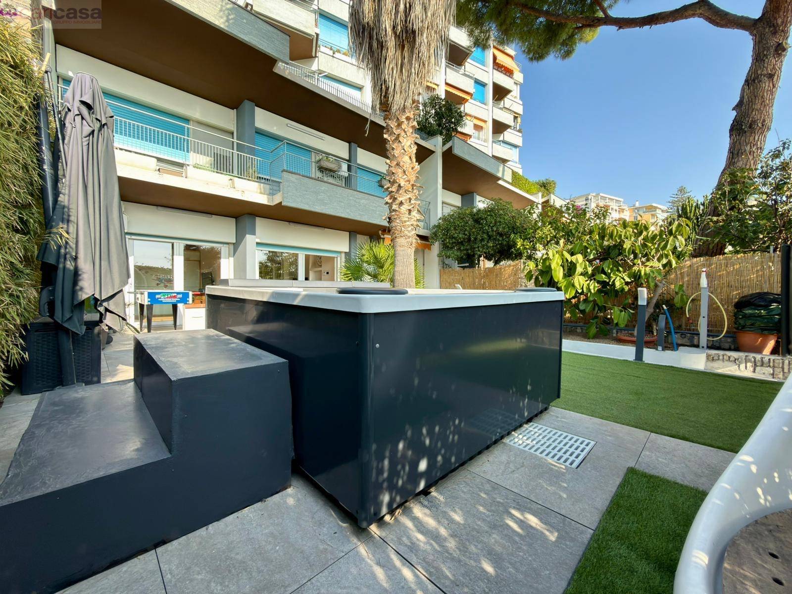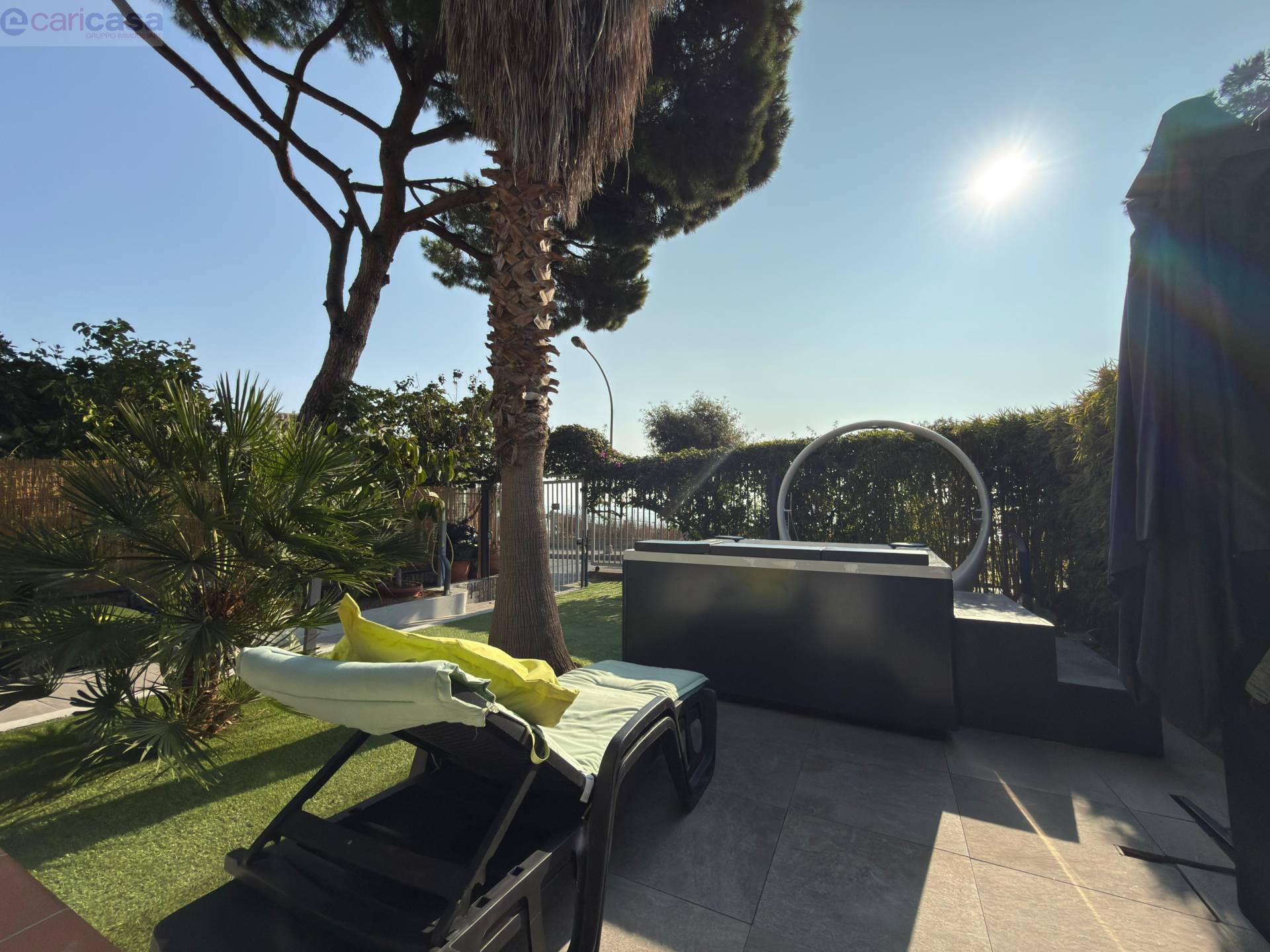 All’esterno, un meraviglioso giardino arredato con piscina jacuzzi offre uno spazio ideale per rilassarsi e godere appieno del clima mite e della vista mare.Dotazioni di alto livello: aria condizionata, tapparelle elettriche, impianto di videosorveglianza e finiture di ultima generazione.
